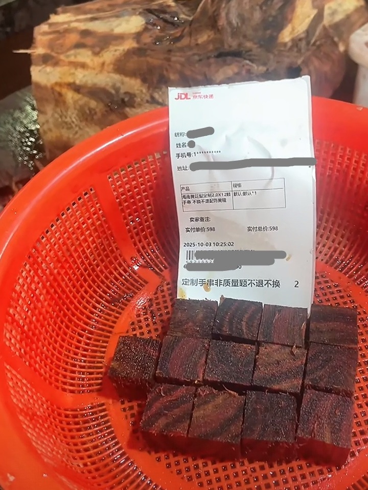 前几天,博主在抖音直播间被天花乱坠的直播话术所迷惑,在某现场开料制作手串的直播间以598元的“天价”购买了一串貌似品相不错的手串。到手后,发现就是漫天飞的新料手串。直播间和实物颜色差距还是很明显的。当然,要问是什么心态,就是想捡漏。但归根结底还是文玩无漏可捡。所谓的现场开料,售卖者所有的木料都不可能存在老料,一切的价格高低都来自于主播的吹嘘。吹的好了贵点,偶尔“真诚”一下,给个处理价。结论就是在同一直播间,不管是便宜的还是贵的都是一类的木料,没有高货。